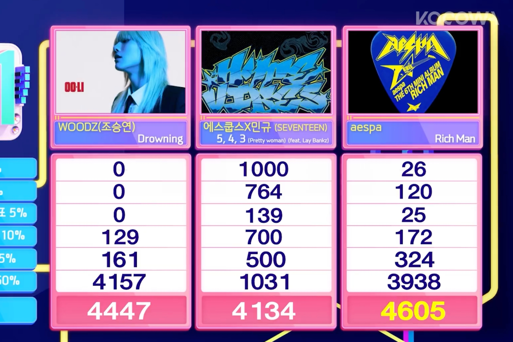 On October 12, SBS’s “Inkigayo” returned to air after a one-week break as a result of Chuseok vacation. This week’s candidates for first place had been WOODZ’s “Drowning,” SEVENTEEN’s CxM’s “5, 4, 3 (Pretty woman),” and aespa’s “Wealthy Man.” aespa in the end took the win with a complete of 4,605 factors.